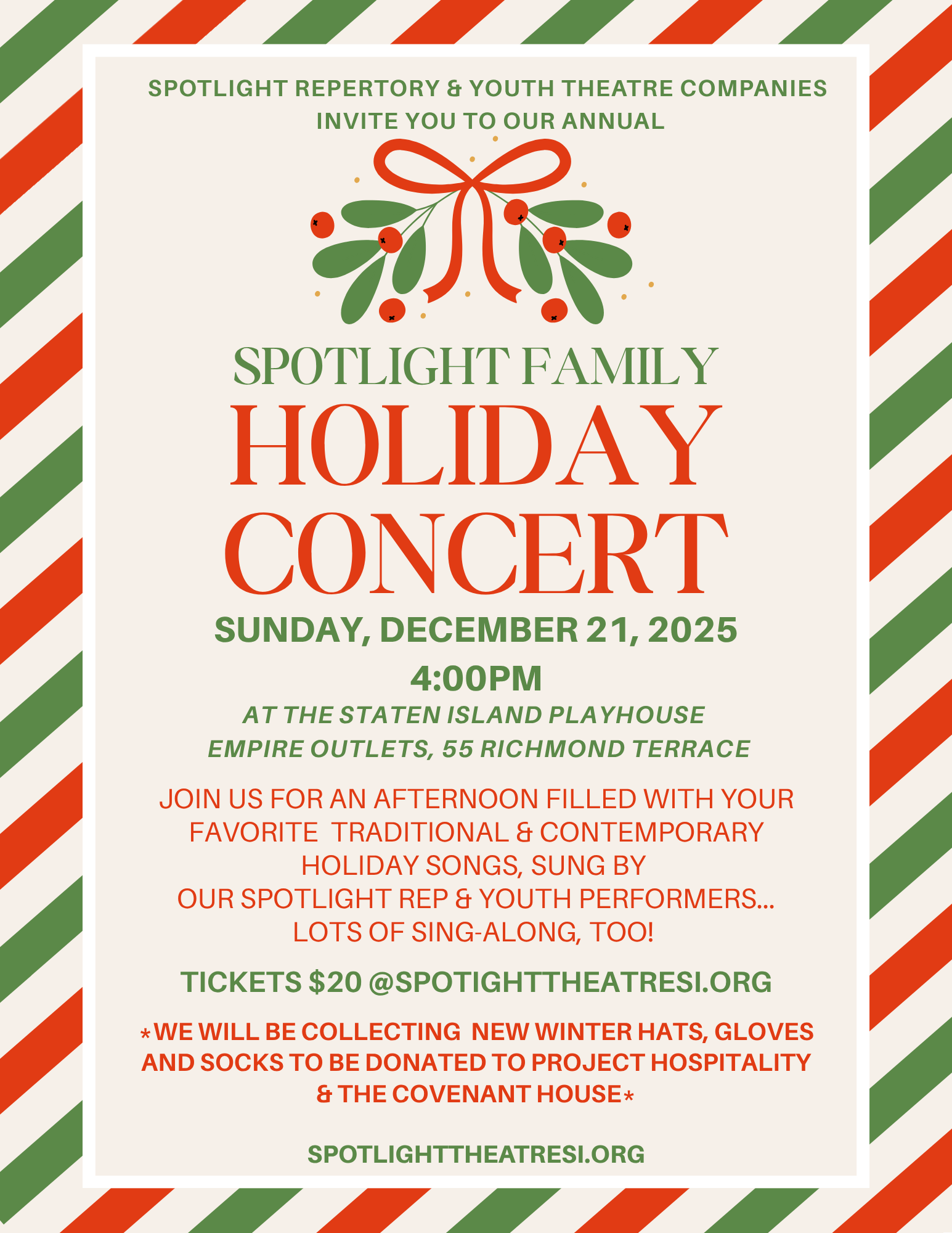 Please join us on Sunday, December 21 at 4:00pm for an afrernoon filled with your favorite holiday tunes performed by members of Spotlight Repertory & Youth Companies.