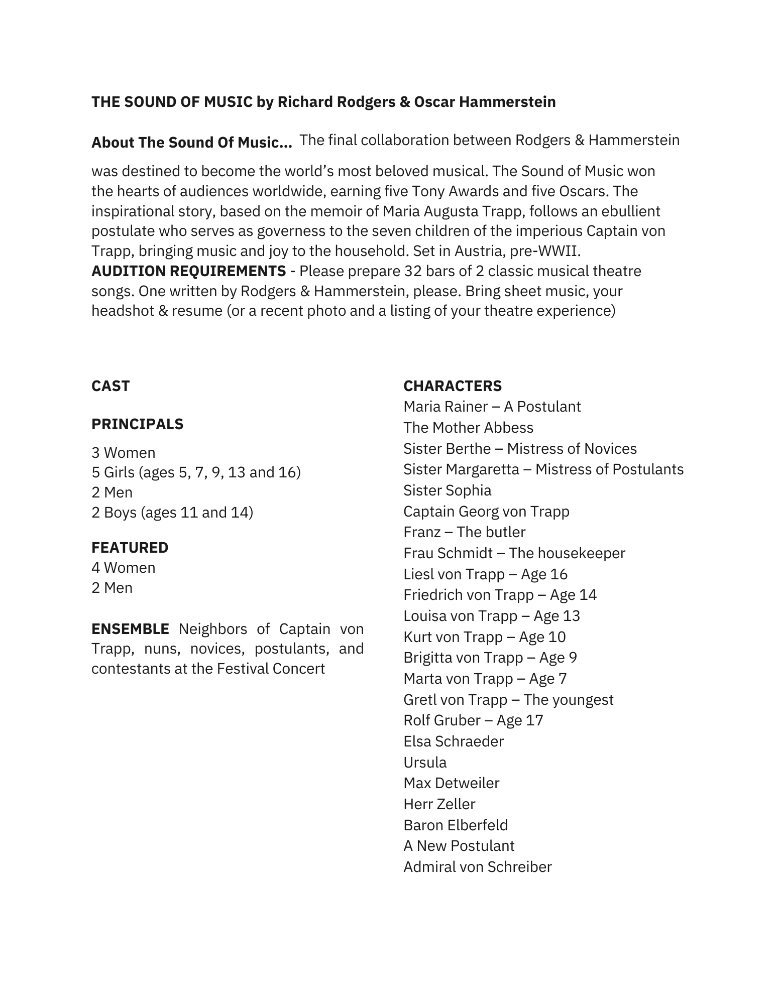 APPOINTMENTS Sun, May 4, 5:00 - 8:00pm ~ To request an appointment, please submit a video audition of 16 bars of your favorite classic musical theatre song. Please take a moment to tell us something about yourself. Submit to: [email protected] no later than April 2, 2025. Write: SOM Appointment Request in the subject line.