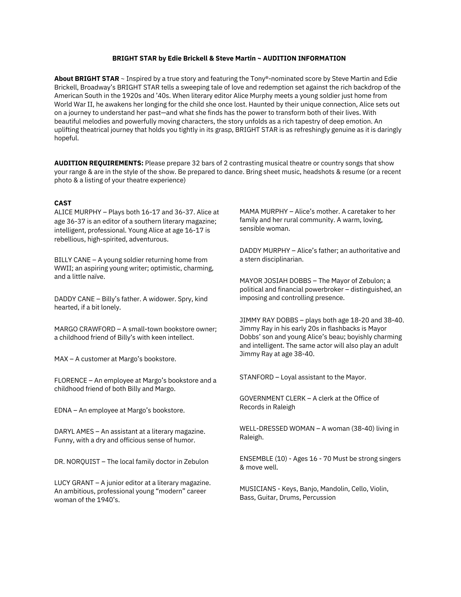 AUDITION LOCATION: The Staten Island Playhouse at Empire Optlets, 55 Richmond Terrace, Staten Island, NY 10301 (A 5 minute walk from the St George Ferry Terminal)